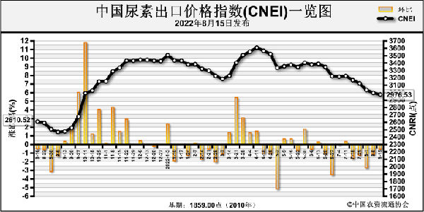 8月15日中國尿素出口價(jià)格指數(shù)(CNEI)為2976.53點(diǎn),環(huán)比下跌21.06點(diǎn),跌幅為0.70%;同比上漲366.01點(diǎn),漲幅為14.02%;比基期上漲1117.53點(diǎn),漲幅為60.11%。