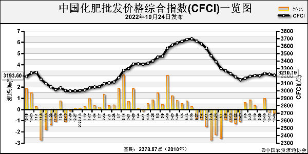 10月24日中國(guó)化肥批發(fā)價(jià)格綜合指數(shù)(CFCI)為3210.19點(diǎn),環(huán)比下跌12.99點(diǎn),跌幅為0.40%;同比下跌30.27點(diǎn),跌幅為0.93%;比基期上漲831.35點(diǎn),漲幅為34.95%。